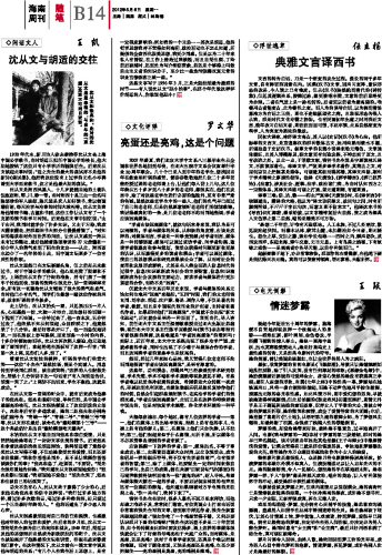 1920年代末,新月诗人徐志摩推荐沈从文去上海中国公学教书,当时胡适正担任中国公学的校长,他大胆地接纳了这位只有小学学历的腼腆后生。后来沈从文谈起此事时说:“适之先生的最大的尝试并不是他的新诗《尝试集》,他把我这位没有上过学的无名小卒聘请到大学里来教书,这才是他最大胆的尝试。” 沈从文是湘西凤凰人,十几岁就随当地的土著队伍浪迹湘、鄂、川、黔一带。当时湘西十县正由一位名叫陈渠珍的军人统领,陈氏虽是武人却好读书,常以曾国藩自诩,每天治学与治事的时间大致相等。沈从文负责给他管理书籍、古董和书画,这份工作让从文有了一个充裕的读书和学习时间。后来他在文章中回忆说:“由于应用,我同时就学会了许多知识。又由于习染,我成天翻来翻去,把那些旧书大部分也慢慢看懂了。”对知识的渴求和对外面世界的向往,让沈从文感到一阵从未有过的躁动,最后他揣着陈渠珍送的27元盘缠和一份少年人的勇气来到了陌生的北京———从此,湘西酉水边少了一名年轻的士兵,而中国文坛则多了一位有灵性的作家。 沈从文虽然已在文坛崭露头角,但之前却从未教过书,对于中国公学的教职,他心里充满了期望和不安。上课前沈从文作了仔细的准备,并专门雇了一辆车子拉他到校,预备的资料也很充分,讲一堂课绰绰有余。所有这一切都给沈从文增添了很大的勇气和底气,当时他已小有名气,同学们也都想一睹这位作家的风采,故来听课的学生极多。 走上讲台,沈从文抬头一望,只见黑压压一片人头,心里蓦然一惊,大脑一片空白,原先想好的话题一下抛到了爪哇国。一分钟过去了,他一言未发,五分钟过去了,他依然不知从何说起,众目睽睽之下,他竟然呆了十几分钟。最后好容易开口了,他一面急促地讲述,一面在黑板上抄写提纲,原来预备一小时的内容,十多分钟便匆匆而毕。沈从文再次陷入窘迫,他无助地望了望同学们,拿起粉笔在黑板写了这样一行字:“我第一次上课,见你们人多,怕了。” 看着沈从文怯怯的模样,听课的学生们哄堂大笑———这位“小先生”虽然怯场,倒是个实诚人。消息传到学校同仁那里,被当成笑料:“这样的人也配做先生,居然十几分钟讲不出一句话来!”有人向胡适告状,胡竟一笑了之:“上课讲不出话来,学生不轰他,这就是成功。” 在沈从文第一堂课的听众中,就有后来成为他妻子的张兆和。张兆和聪明可爱,单纯任性,是中国公学最漂亮的校花,沈从文很快便爱上了这位活泼的女弟子。兆和身后有许多追求者,她的二姐张允和分别给他们编号为“青蛙一号”、“青蛙二号”、“青蛙三号”等等,沈从文排在最后,被命名为“癞蛤蟆第十三号”———这个典故估计是出自“癞蛤蟆想吃天鹅肉”。 木讷的沈从文不敢当面向张兆和表白爱情,只是悄悄地给她寄去了一封封文字优美的情书。后来张兆和拿着这些信找校长胡适理论,孰料胡适看了竟然夸奖沈从文写得不错,不但劝她接受沈的爱情,而且还要亲自做媒:“我和你爸爸是同乡,是不是让我跟你爸爸谈谈你们的事?”张兆和急了,赶紧说,“不要讲。”胡先生很郑重地告诉她:“我知道沈从文很顽固地爱你!”张兆和脱口说道:“我顽固地不爱他!”胡先生笑了,张兆和也被自己的话逗笑了。 功夫不负有心人,沈从文终于赢得了少女的心,后来他在给张兆和的信中这样说:“我行过许多地方的桥,看过许多次数的云,喝过许多种类的酒,却只爱过一个正当最好年龄的人。”他的话道出了多少恋人的心声。 沈从文很感激胡适对自己的信任和提携,也感激他对年轻人的包容和爱护,在后来的岁月里,沈从文一直将胡先生视为自己的良师和益友。1949年后,胡适以及他的思想理所当然成为新政权批判的靶子,沈从文也被迫离开了他熟悉的文坛和讲堂,徘徊在故宫昏黄的灯影中。在这种情况下,沈从文曾在一篇文章中谈及他与胡适的关系:“有几个人在我生活上思想上,是有 王 凯 一定程度影响的:例如我的一个兄弟……其次是胡适,他的哲学思想我并不觉得如何高明,政治活动也不怎么知道,所提倡的全盘西化崇美思想,我更少同感。但是以为二十年来私人有情谊,在工作上曾给过我鼓励,而且当胡也频、丁玲前后被捕时,还到处为写介绍信营救,总还是个够得上叫做自由主义者的知识分子,至少比一些贪污狼藉反复无常的职业官僚政客正派一些。” 这些文字写于1956年3月,正是大陆批胡最为激烈的时节———有人说沈从文“胆小怕事”,在那个年代敢这样评价胡适的人,你敢说他胆小? |