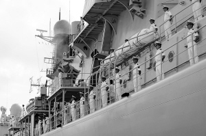 中国海军军舰首次访问罗马尼亚八月四日圆满结束,驶离康斯坦察港口。“烟台”号护卫舰官兵向岸上欢送人群挥手致意。 新华社记者林惠芬摄