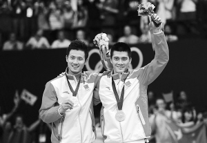 北京时间8月5日晚,在伦敦奥运会羽毛球男双决赛中,四届世锦赛冠军蔡赟/傅海峰令“中国风暴”席卷温布利,他们在决赛中以2:0(21:16,21:15)力克丹麦名将鲍伊/摩根森,夺得了梦寐以求的奥运金牌。中国羽毛球队史无前例地实现了包揽奥运会羽毛球五枚金牌的壮举。图为蔡赟(左)/傅海峰在领奖台上。 小新发