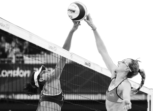 8月8日,在女子沙滩排球半决赛中,中国选手薛晨/张希以0:2不敌美国选手沃尔什/梅·特雷纳,无缘决赛。 图为中国选手薛晨(左)、美国选手沃尔什在比赛中。 新华社发