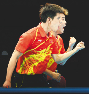 北京时间8月9日凌晨,伦敦奥运会乒乓球男子团体比赛收拍,凭借马龙、张继科单打拿下的两分,以及张继科/王皓双打夺得的一分,中国队以总比分3:0力克韩国队,卫冕该项目的冠军。中国乒乓球队再次包揽奥运会乒乓球赛全部4枚金牌。 图为张继科(前)/王皓在双打比赛中。 新华社发