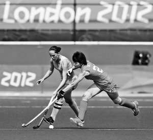 10日,在女子曲棍球比赛中,澳大利亚队以2:0战胜中国队,获得第5名,中国队获得第6名。图为中国队德娇娇(右)与澳大利亚队布莱斯在比赛中争抢。 新华社发