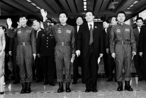 据新华社香港8月10日电 8月10日,天宫一号与神舟九号载人交会对接任务代表团抵达香港,开始为期4天的访问。 香港特区政府10日晚在湾仔香港会议展览中心举行晚宴,欢迎天宫一号与神舟九号载人交会对接任务代表团到港访问。 香港特区行政长官梁振英,代表团团长、中国载人航天工程副总指挥牛红光,分别致辞并互赠纪念品。约300名特区政府官员、中央政府驻港机构代表、社区人士等出席了晚宴。 图为航天员景海鹏(前右三)、刘旺(前右一)、刘洋(前左一)等代表团成员抵达香港国际机场。 新华社发
