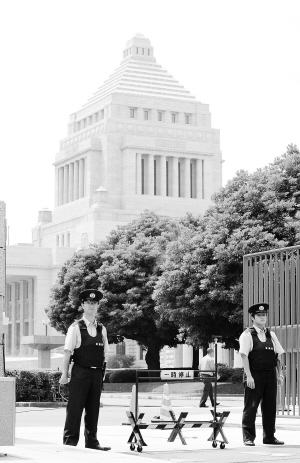 8月10日,警察在位于日本东京的国会议事堂前警戒。 当日,日本国会参议院全体会议表决通过了以提高消费税率为主要内容的社会保障与税制一体化改革相关法案。 新华社发