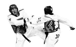 8月11日,在跆拳道男子80公斤以上级比赛中,刘哮波(左)以6:4战胜爱德华,晋级八强。 新华社发