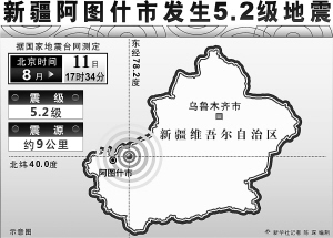 新华社北京8月11日电 据国家地震台网测定,北京时间2012年8月11日17时34分,在新疆维吾尔自治区克孜勒苏柯尔克孜自治州阿图什市(北纬40度、东经78.2度)发生5.2级地震,震源深度约9公里。