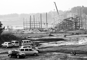 郑州北郊的黄河花园口因1938年的决堤事件闻名于世,如今,这里已经开辟为旅游景区。记者在景区看到,一处大型水上游乐项目正紧邻黄河大堤内侧修建,挖土机、吊车等来回穿梭,十几米高的水上滑梯已经矗立起来,周围的脚手架上有工人在进行焊接作业,不远处还栽植了不少景观树。