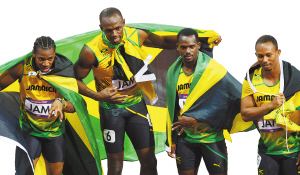 | 牙买加4×100米接力队员布雷克、博尔特、卡特和弗拉特(从左至右)在夺冠后合影。 新华社发 |