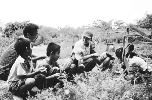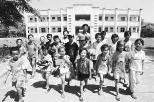 | 海南返乡大学生志愿服务队志愿者、定安县潭黎小学校长陈显德和他的学生。 张 茂 摄 |