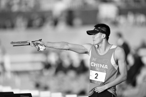 | 曹忠荣在现代五项跑射比赛中射击。 新华社发 |