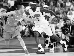 北京时间8月12日晚,在伦敦奥运会男篮决赛中,美国男篮梦十队以107:100击败西班牙队,卫冕奥运冠军。这是美国男篮在奥运会上第14次冠军。图为詹姆斯(前右)在比赛中运球。 新华社发