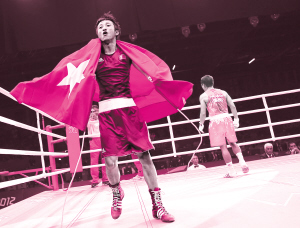 为中国代表团夺第38金 北京时间12日凌晨,在伦敦奥运会拳击馆,31岁的中国拳击手邹市明击败泰国“黑马”庞普里亚杨,蝉联奥运会男子拳击最小级别的冠军,同时也为中国体育代表团献上第38块金牌。 图为邹市明身披国旗庆祝胜利。 新华社发