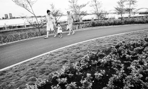 | 市民在新建的海口滨江西路沿江慢行道散步。 本报记者 张杰 摄 |