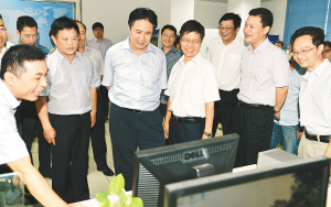 | 8月15日上午,省委书记、省人大常委会主任罗保铭先后到人民日报社海南分社和新华社海南分社调研。图为罗保铭在新华社海南分社的办公平台,仔细了解新闻采编流程。 本报记者 王凯 摄 |