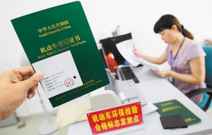 8月15日,工作人员正在为车主办理汽车环保标志。据了解,为加强机动车排气污染防治工作,防治PM2.5污染,进一步提高海口环境空气质量,海口已全面实施机动车环保标志管理制度,并从今年9月起,在主城区部分道路对未取得绿色标志的高排放车辆适时推出限行措施。从4月起,海口市环保局在海口市区设立7个核发点办理环保标志,至今已办理9万多辆,约占全市车辆总数284487辆的三分之一。 本报记者 张杰 摄影报道