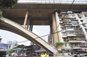 贵阳市水口寺大桥300多米长的引桥下面,排列着10多栋居民建筑楼,从桥头一直蜿蜒到桥尾。房屋的楼顶与桥板之间的距离最短处不足一米,乍一看,还以为这些居民楼就是支撑大桥的桥墩。此处桥面是贵阳市的东出口和龙洞堡机场通道,车流量大,重车多,上百户在这里居住的市民,头顶着大桥过着“蜗居”生活。每到重车经过时,房屋也会和大桥一起抖动。