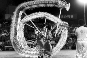 | 19日,2012年中国(海南)舞龙舞狮公开赛在保亭举行,共有国内外14支队伍参赛。图为选手在比赛中。