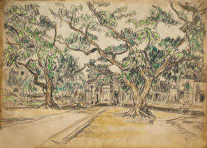 指着其中一张画作,符史雄说:“这张画的肯定是五公祠。画上那棵分叉很多的树就是祠里的老鸡蛋花树。”昭和二十年(1945年),是海南日报记者在高木勇次的几十张展出画作中唯一找出的一个时间记录。70多年以后,当年的侵略者在中国人民的顽强抗争中已经被击退,而这顽强的老鸡蛋花树也依然生机盎然地扎根在五公祠中。