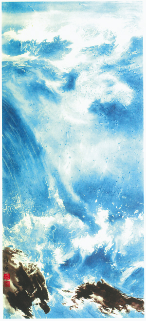 同样,既有中华文明积淀、又受国际艺术潮流影响的港澳台美术,也有着颇为博杂的景观,尽管这次赴琼展出的香港画家称“没料到海南画家水平如此之高,早知应带更多更好作品前来”,但实际上这次展览中港澳画家的作品,也已颇具水准。像黄孝逵的《清水居》就是一幅将中国水墨画与西方现代派乃至日本装饰画融为一体的作品;更重要的是其作品透露出来的气质是现代性、都市性的,尽管画面上并无人的踪影,更无高楼林立的景象,但如此“心象”,似乎只有在现代大都市的香港方能萌生。此外,王秋童的《东风随春归 发我枝上花》及林湖奎的《温馨》则更多体现了香港画家对中国画艺术传统及中国人生命情怀的温暖回归。熊海作为香港的新生代画家,更有着中西融汇的努力。他的水墨画《浪韵》,便具有先锋性和实验性,给人带来一股清新的气息。