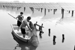 江苏省建湖县建阳镇建设的光伏电站是江苏省首座“渔光互补”光伏电站,其在河网密集的地区架设光伏组件,形成“上可发电、下可养鱼”的发电模式。今年以来,“渔光互补”光伏电站发电量达1576万千瓦时,实现了渔业增产和节能减排两不误。 新华社发(濮良平 摄)