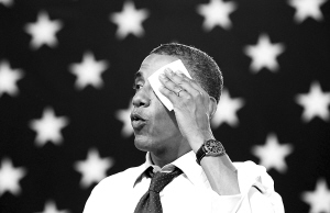 | 奥巴马在新罕布什尔州闷热的体育馆里擦汗。 新华社/路透 |