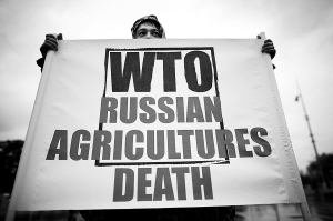 | 2011年12月16日,一名抗议者在日内瓦参加一个反对俄罗斯入世抗议活动,手持的标语上写着“WTO,俄罗斯农业面临死亡”。 新华社/法新 |