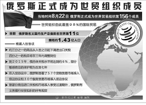 22日,俄罗斯正式成为世界贸易组织(世贸组织)第156个成员,漫长而又曲折的入世之路终于画上句号。此举为俄罗斯进一步融入世界经济打开新局面,为推动建设公平有效的多边贸易体系创造新契机。