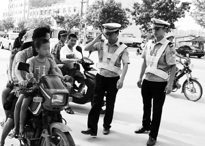 今天上午,记者在定城镇见龙大道看到,当地民警正对来往车辆进行检查,坚决不放过一辆存在违法行为的车辆。有一辆没有任何牌照的摩托车上竟然共载着5个人,定安交警依法对这辆超载摩托车进行暂扣,并对车主进行了安全行车教育。