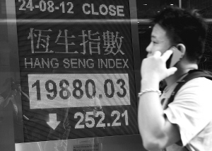 8月24日,市民从香港湾仔一家银行的恒生指数电子显示屏前走过。 当日,香港恒生指数低开1%,全日走势平稳,在19840点和19930点之间小幅波动前行,收盘跌252点,跌幅为1.25%,收报19880点。 新华社记者 黄本强 摄