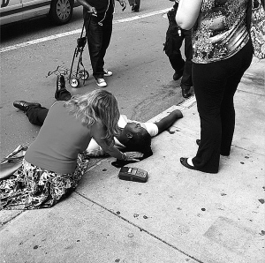 八月二十四日,行人正在看护着一名纽约帝国大厦枪击事件遇难者。 新华社/美联