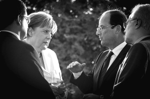 德国总理默克尔(左)和到访的法国总统奥朗德(右)在柏林总理府交谈(8月23日摄)。默克尔和到访的奥朗德23日在柏林敦促希腊继续实行改革和紧缩计划。 新华社/法新