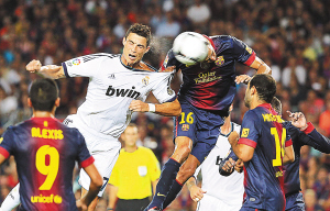 北京时间8月24日凌晨,2012年西班牙超级杯第一回合在巴塞罗那队主场诺坎普展开角逐,坐镇主场的巴塞罗那队以3:2战胜皇家马德里队。图为皇马前锋C罗与对方球员布斯克茨争夺头球。 新华社发