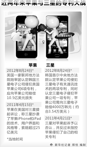 首尔中央地方法院法官裁定,苹果侵犯三星两项通讯技术专利,但同时裁定三星侵犯苹果一项专利。按照判决,双方需互相赔偿数万美元。