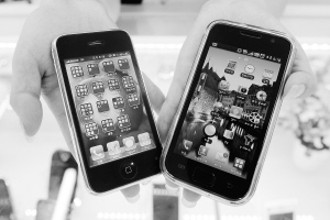| ↑2010年7月27日在韩国首尔拍摄的一名商场经理展示三星Galaxy S智能手机(右)和苹果iPhone 3G智能手机的资料照片。 新华社/法新 |