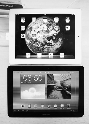 | ↑2011年8月16日在荷兰海牙拍摄的三星Galaxy Tab 10.1平板电脑(下)和苹果iPad 2平板电脑的资料照片。 新华社/法新 |