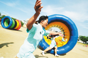 | 2012年海南省全民健身(趣味)体育运动会动感五环项目中,赛场边啦啦队为队友呐喊助威。 本报记者 张杰 摄