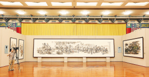 | 八月二十八日,一位摄像师在拍摄当代国画优秀作品展———海南作品展。