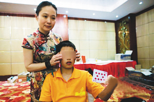 雷雅茹的初级班课程分为两部分,先背圆周率,再学蒙眼识字。“呼吸,再呼吸,闭眼呼吸,慢慢会有光进来……”孩子们在她的带领下把窄窄的布条蒙在眼睛上,开始感知扑克牌的颜色,在她的不断“鼓励”下,孩子们似乎在短时间里就纷纷学会了这项“神奇”的功能。