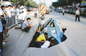 8月29日,河北省邯郸市一辆出租车在联纺路由东向西行驶中,路面突然发生塌陷,出现一个长约7米、宽约5米、深约3米的大坑,出租车坠入坑中。事故发生后,当地交警、市政人员立即赶往现场救援,出租车司机及搭载的一名乘客被送往医院。路面塌陷原因尚在调查中。 新华社发