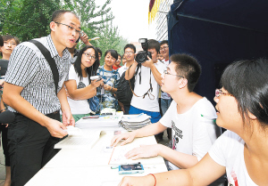 ↑ 8月30日,来自黑龙江省大庆市东风中学的“保安哥”訾立正式在天津大学报到,訾立(左一)在办理入学手续。他被天津大学化工学院应用化学专业录取。 新华社发