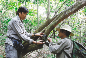 | 在鹦哥岭自然保护区,保护区工作人员王合升(左)和护林员在安装红外相机,用以监测记录可能出现在该区域的兽类动物。 本报记者 宋国强 摄 |