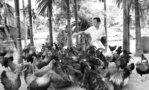 | 8月30日,三亚市育才镇龙密村村民在喂黑脚山鸡。 本报记者 苏建强 摄