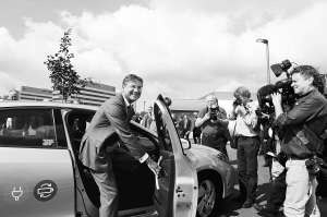 9月3日,在荷兰阿姆斯特丹,荷兰副首相兼经济、农业与创新大臣费尔哈亨(左)试乘一辆电动汽车。 当天,荷兰首座电动汽车“换电站”在首都阿姆斯特丹的斯希普霍尔机场正式投入使用。这一换电站是基于将电动汽车的整车与电池部分实行分离的理念而建造的,可以自动把电动汽车上电量耗尽的电池更换为一个电量充足的电池,耗时不过五分钟。 新华社发