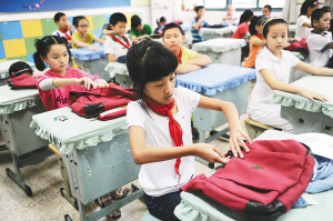 9月4日,杭州市大关小学四年级三班的学生在放学后整理书包。