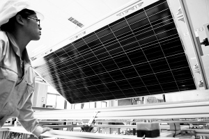 | 图为江苏连云港一家能源公司的工人在检验出口欧洲的太阳能光伏产品。 新华社发 |