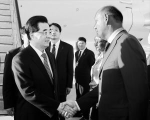 | 图为胡锦涛主席在机场受到俄罗斯政府及当地高级官员的热情迎接。 新华社发 |