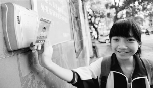9月6日,来自海南师范大学附属中学的黎乐欣同学刷“卡”进校园。 据悉,从9月3日开始,海师附中学生每天刷“卡”进校园,并即时将学生到校离校考勤短信通知发至家长手机上。这种利用现代通讯手段对校园管理的方式既高效又安全,受到学生和家长的普遍欢迎。 海报集团全媒体中心记者 张茂 摄