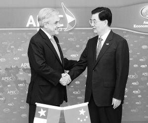 9月9日,国家主席胡锦涛在俄罗斯符拉迪沃斯托克和智利总统皮涅拉共同出席《中智自由贸易协定关于投资的补充协定》签字仪式。这是两国元首在签字仪式后握手致意。 新华社发
