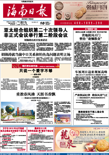 海南日报 头版 001 2012-09-101 2012年09月10日 星期一