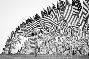 | 9月9日,一名男子走在美国加利福尼亚州马利布的佩珀代恩大学草坪上竖立的国旗旁。这些国旗代表着在9·11恐怖袭击中不幸遇难的人。 新华社/法新 |